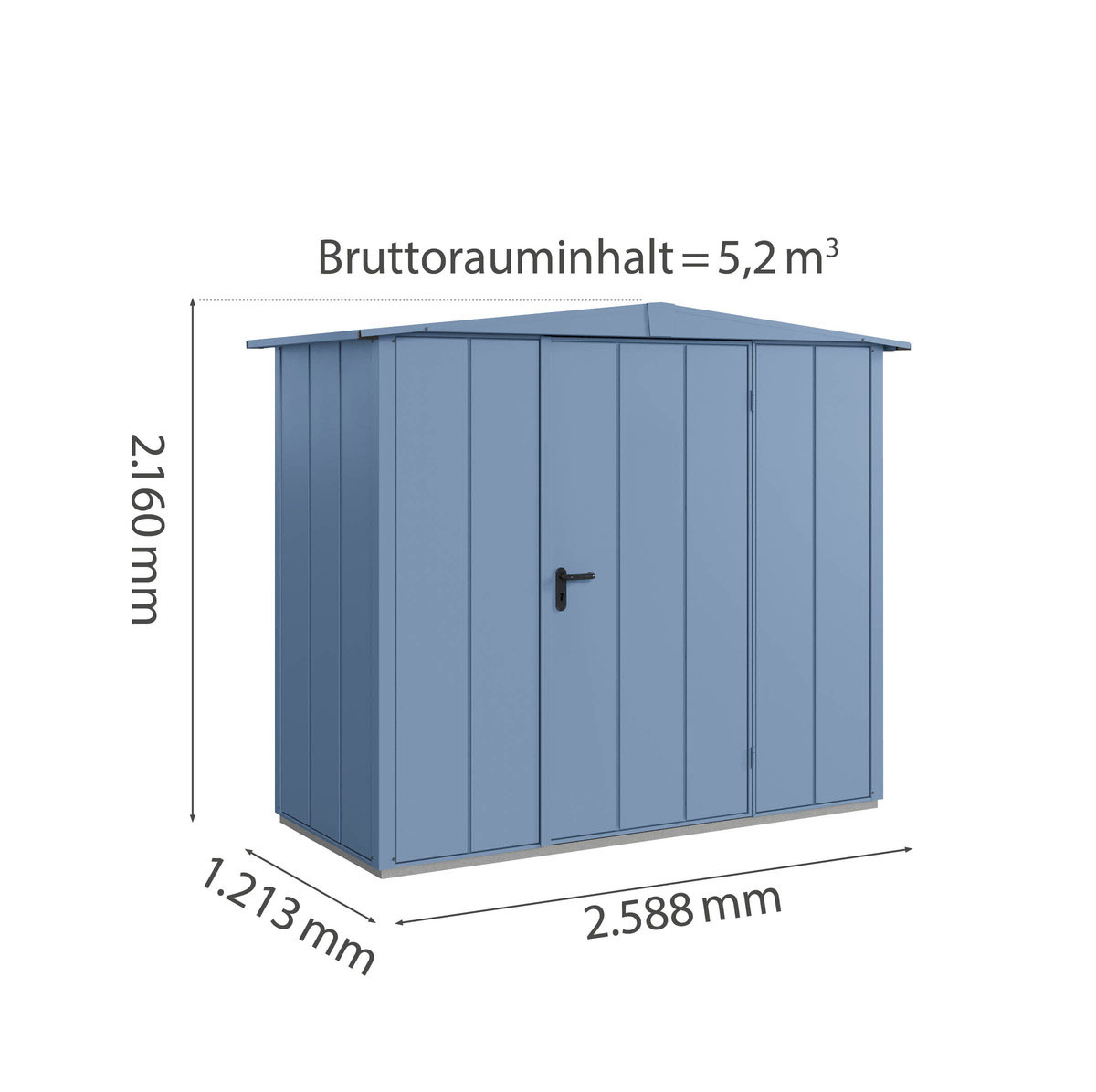 Hörmann Berry-Gerätehaus Modern-S, Typ 1 mit Satteldach – Taubenblau (B 258,8 x H 216 x T 121,3 cm)