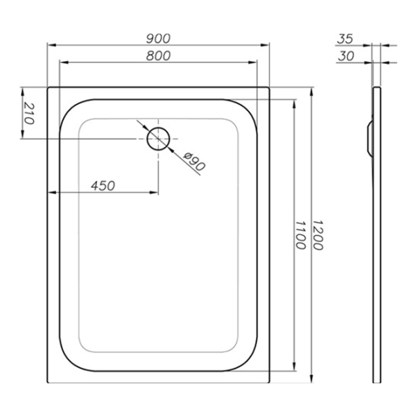 delphis Duschwanne – Stahl-Emaille, Ablaufloch Ø 90 mm, 1200 x 900 x 35 mm, Weiß